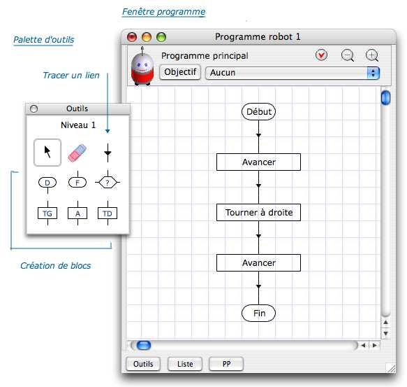 Lancer RobotProg : vous voyez deux fenêtres affichées : la fenêtre de programme où vous allez dessiner l'organigramme du programme et une palette contenant les outils permettant de construire l'organigramme.