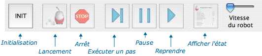 Pendant l'exécution d'un programme, vous pouvez cliquer sur le bouton Pause dans la fenêtre exécution, puis faire exécuter les instructions les unes après les autres en cliquant sur le bouton Exécution pas à pas. Vous pouvez aussi afficher l'état courant du robot en cliquant sur le bouton Afficher l'état. Vous verrez apparaitre alors une liste contenant en particulier des mots-clef utilisables dans les tests.
