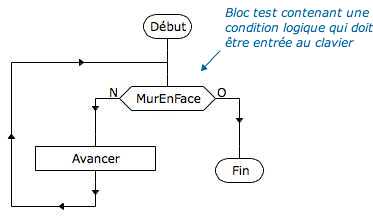 Dans cet exemple, la condition logique est MurEnFace, c'est un mot-clef du langage du robot qui fournit un résultat de type logique (vrai ou faux) en fonction de la position du robot au moment où elle est évaluée